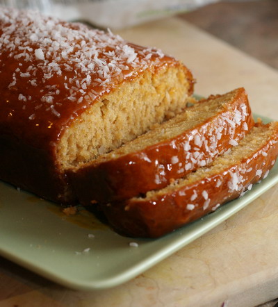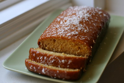 2. Take the  loaf, and using a skewer, pierce it a dozen times right to the bottom.  Pour the glaze over the top of the loaf. The syrup will seep into the cake through the tiny skewer holes.