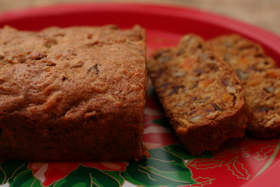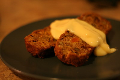 IMG_1282resize   Today’s Gifts From the Kitchen offering is a recipe for Christmas fruit cake that you’ll actually want to eat! Imagine that. ;) (Just kidding to all of you fruit cake lovers out there. My mom is   one of you.) IMG_1283resizeThis fruit cake is not “traditional” (i.e. no glaced cherries, no icing, no disturbingly-long shelf life). Rather, it’s a lovely fruit and nut loaf made with rum-infused apricots and dates, chopped nuts and warm spices. I served it with a slathering of creamy Devon custard and it was a slice of holiday joy.I think this would make a lovely gift or the ideal addition to any dessert table or holiday brunch.IMG_1291resize