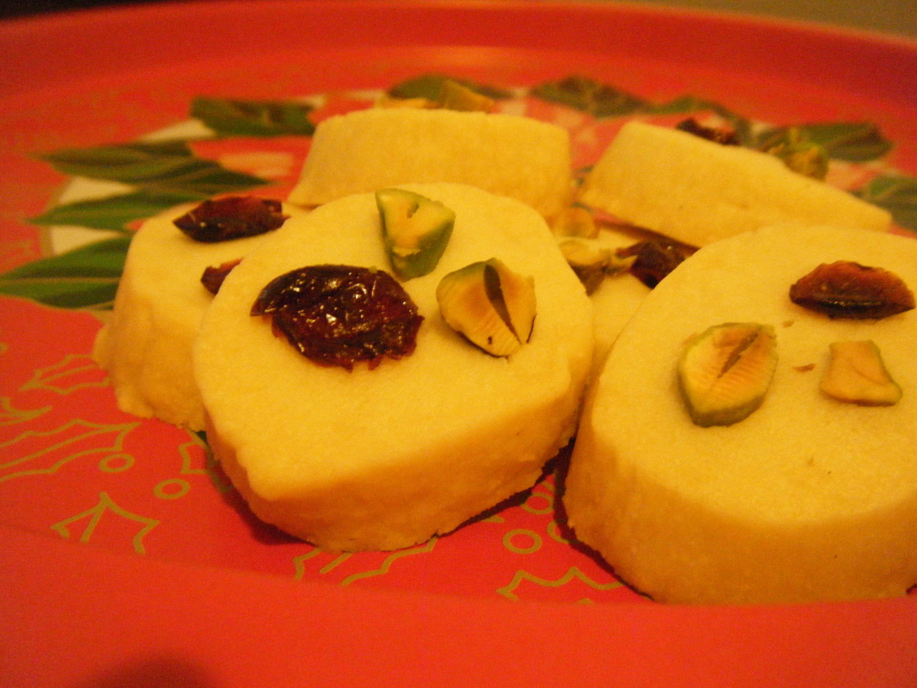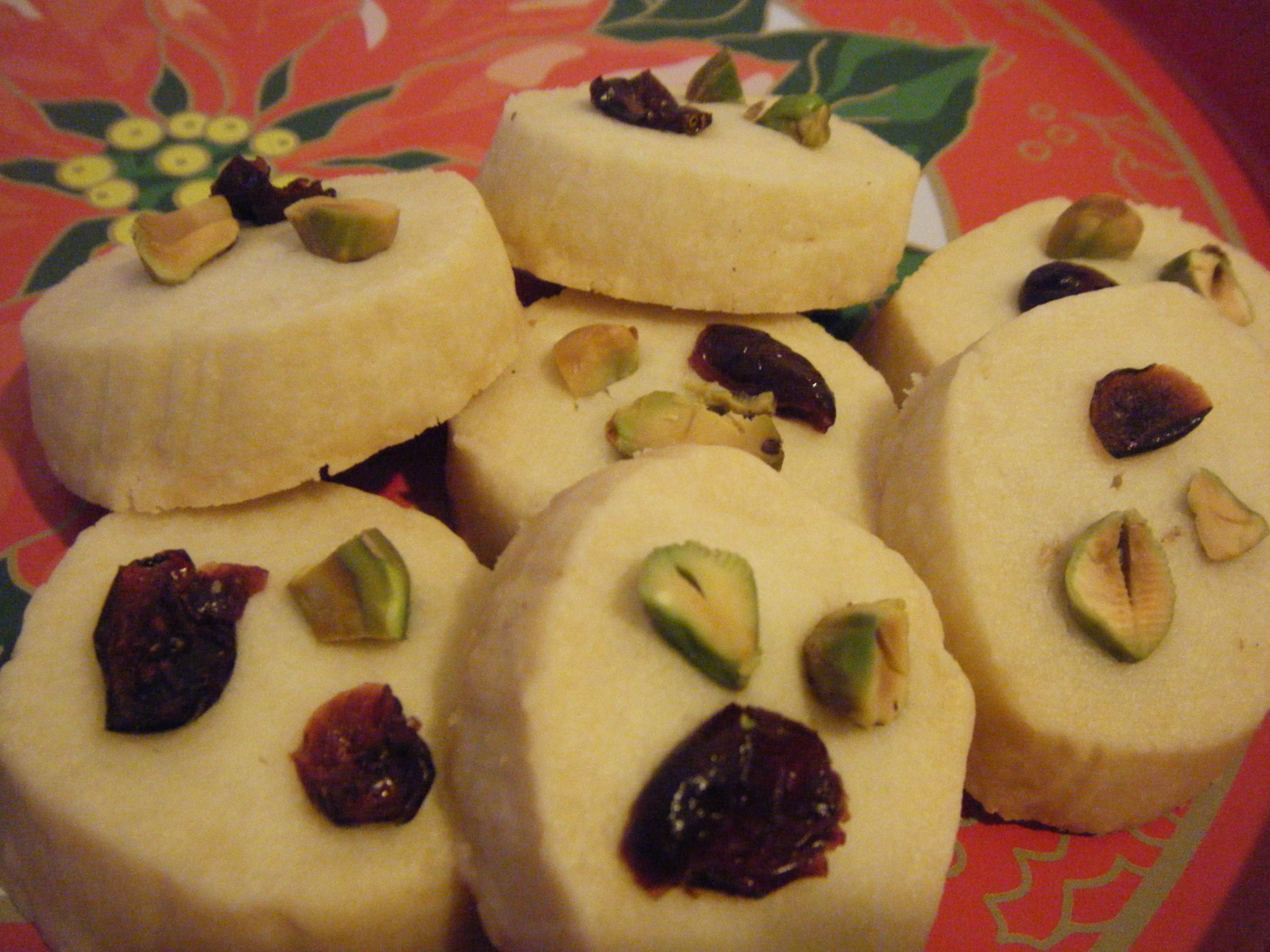DSCF4635  What would the holidays be without cookies? I like this shortbread recipe because of its rich and buttery taste. Also, due to the slice-and-bake method used here, the cookies are easy to handle. One final bonus is that since the cranberries and pistachios are added on top of the cookies just before baking, you have the option of including them or leaving them out, if you are a shortbread purist. :)DSCF4634