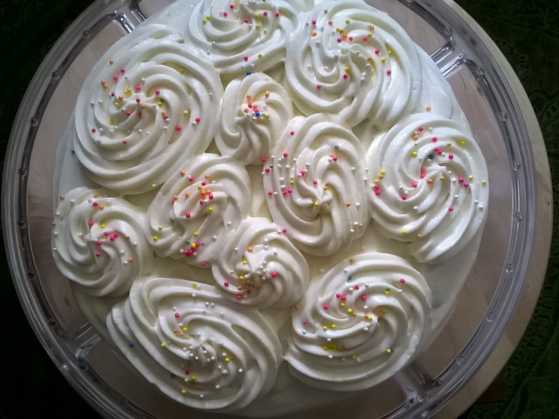 My mom isn’t a big fan of chocolate, but she loves white cakes, so I thought lemon would be a nice choice. The kitchen smelled amazing as I zested the lemons! I added some sprinkles to the batter to make it festive. And I must say, this white chocolate cream cheese icing is the best I’ve had in a long time. So light and fluffy!Birthday cake 2